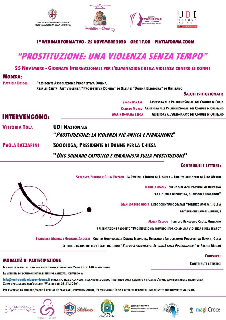 Anche quest’anno, in occasione della Giornata internazionale per l’eliminazione della violenza contro le donne, la nostra Associazione coglie l’opportunità per organizzare un importante evento di formazione e sensibilizzazione sui temi che riguardano la violenza contro le donne. In particolare, quest’anno, data la complicata situazione pandemica, abbiamo deciso di proporre per mercoledì 25 novembre, alle ore 17, quello che sarà il primo di una serie di webinar formativi dal titolo Prostituzione: una violenza senza tempo, organizzato insieme al Centro antiviolenza Donna Eleonora di Oristano, che vedrà la partecipazione di importanti ospiti di rilievo ed esperte in materia. Si è volutamente scelto questo argomento per fare luce su un tema antico e anche ai giorni nostri estremamente complesso e controverso. La prostituzione costituisce da sempre la più grave forma di discriminazione subalterna delle donne e una minaccia alla loro libertà e alla loro salute da parte di un maschilismo imperante che tollera la violenza su di esse e lo “stupro a pagamento”.